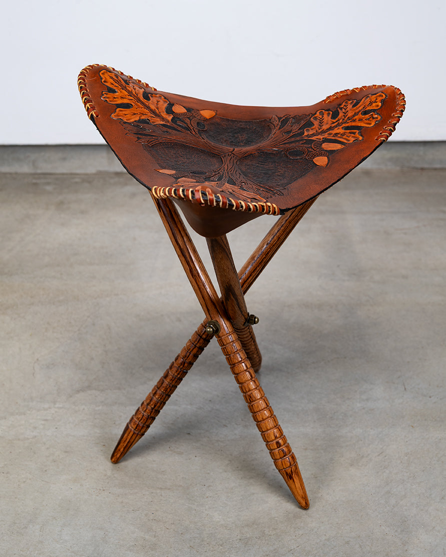 A study in heritage craft, the Field Stool pairs hand-carved vegetable-tanned leather with hand-turned wooden legs to create a piece of timeless utility and beauty. The oak leaf motif, tooled by hand, celebrates nature’s strength and renewal.