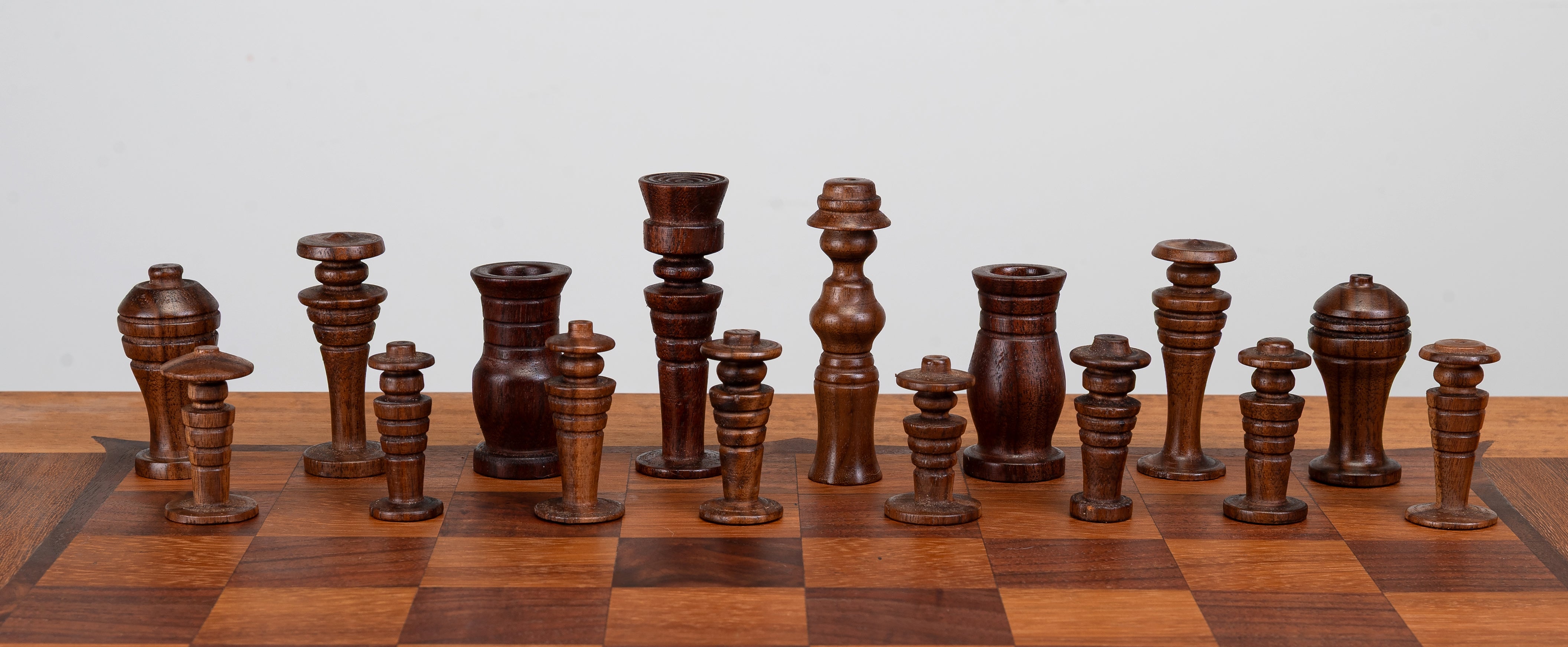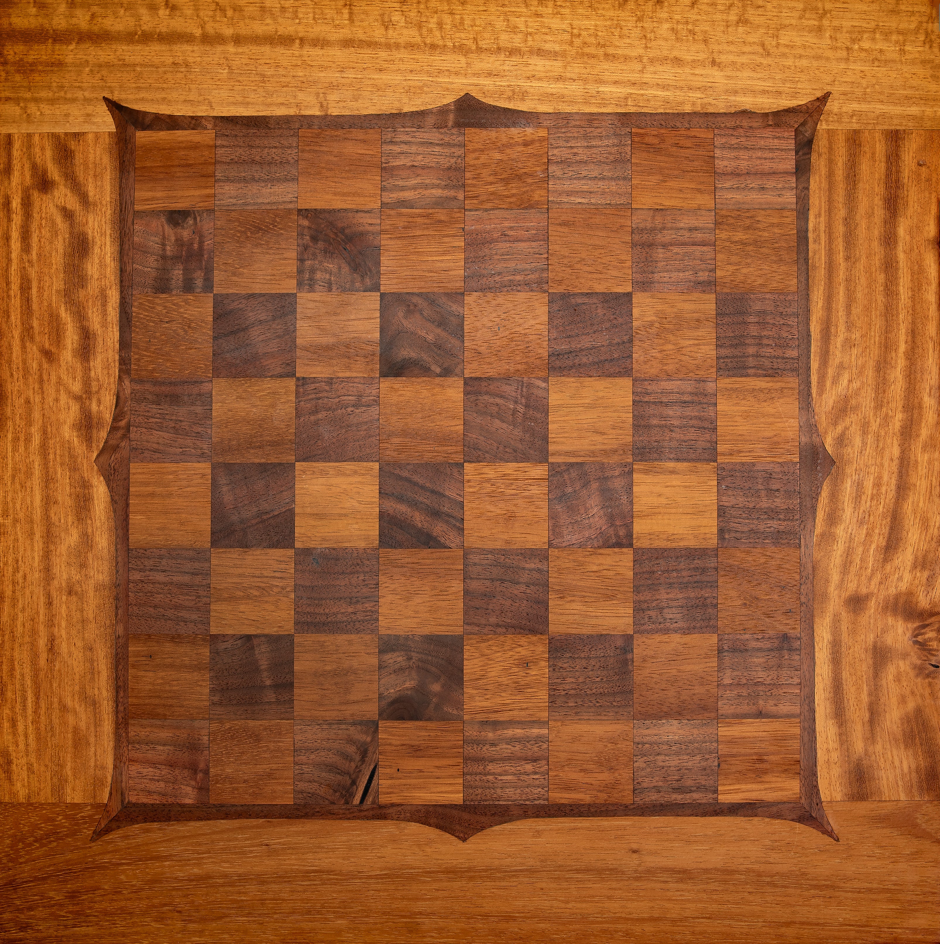 Handcrafted from West African Iroko and American Walnut, the Caïssa Chess Table honors the balance between intellect and artistry. Each square is individually inlaid by hand, and the turned wooden pieces echo the same dialogue of light and dark wood. Subtle sculptural details—chamfered corners, hand-shaped legs, and a refined cross-brace—reflect a devotion to enduring craftsmanship. More than furniture, Caïssa is an heirloom of contemplation and quiet luxury.